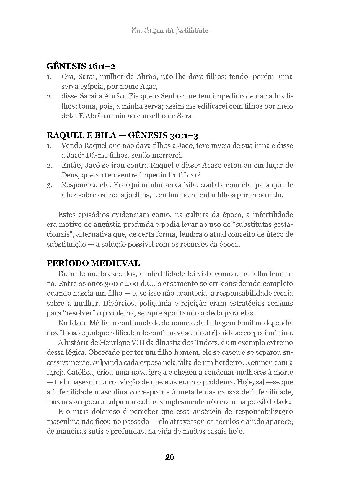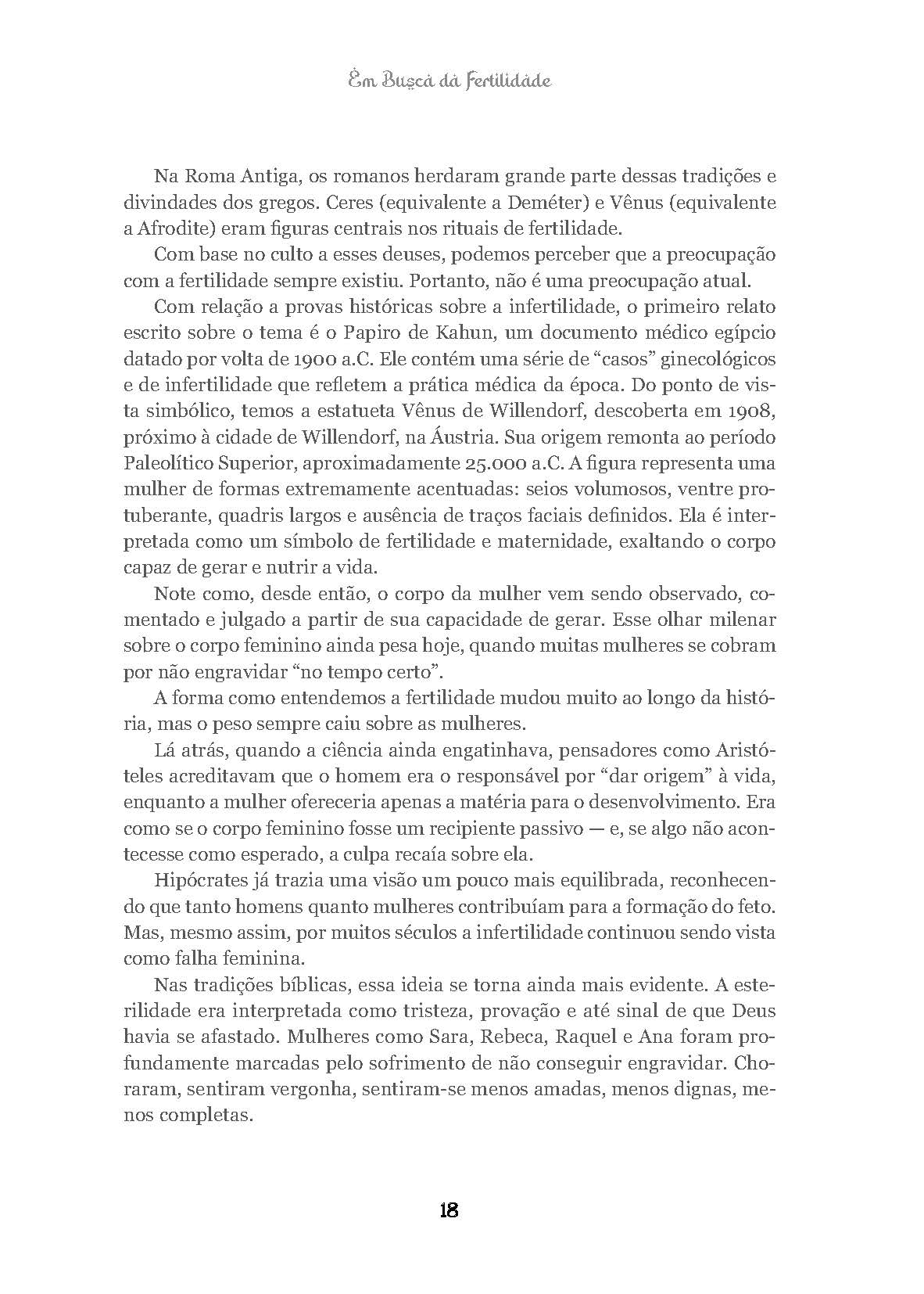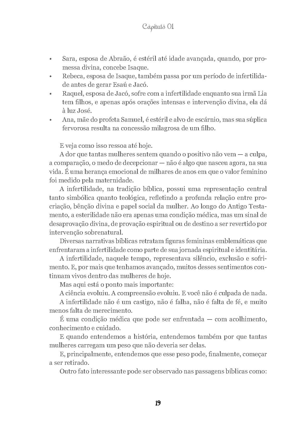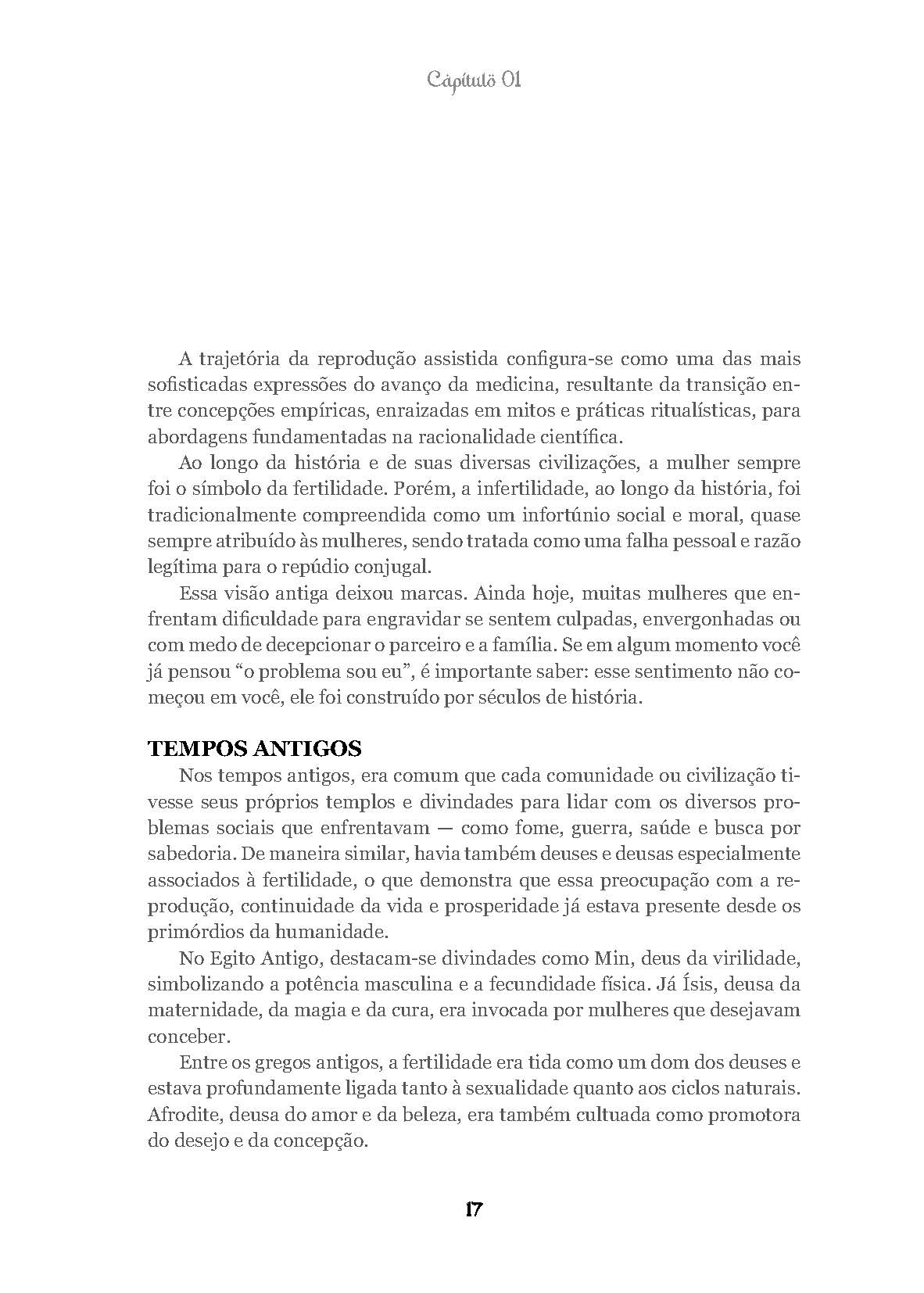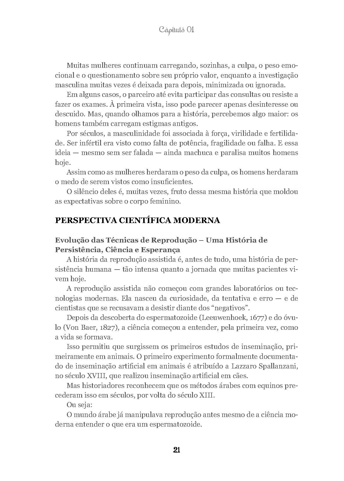 Com linguagem clara, empática e fundamentada em evidências científicas, a obra desconstrói séculos de culpa historicamente atribuída às mulheres, resgata a evolução da reprodução humana desde as crenças antigas até os avanços da medicina moderna e apresenta, de forma honesta, os limites e as possibilidades da fertilidade na contemporaneidade.